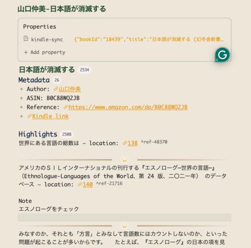 はじめに 下記の記事で読書の記録を取るのにKindleのハイライトを使うやり方が紹介されています。 blog.shibayu36.org ObsidianにはKindleのハイライトを読み込んで新しいノートを作成するプラグインがあって、こういう使い方をする人にとっては便利なんじゃ…